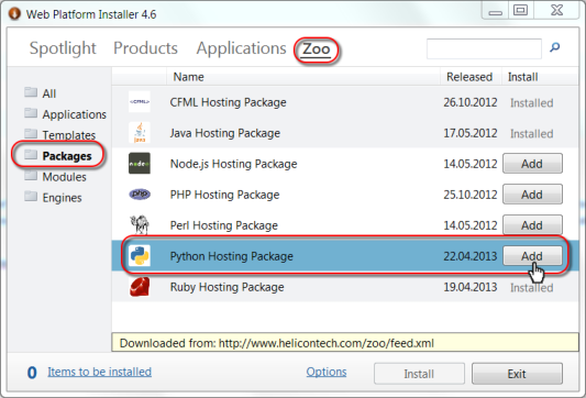 This will install Python 2.7 normally into C:\Python27 folder, Virtualenv, Pip, Flup, Python Imaging Library, MySQL Driver for Python 2.7 and Twisted. All these components are needed for normal Python applications operation, rest of the components will be installed into the application folder itself. Installing Python Hosting Package will also set correct NTFS permissions for Python installation folders for default IIS Application pool settings. You can update Python installation packages manually then, leaving installation folders as they are, because these folders are hardcoded in some WebPI components. But remember – installation packages form Zoo repository has been tested with Zoo while you are upgrading on your own risk. Python Hosting Package may also install IIS and other Windows components as dependency if they are not already installed in the system. Eventually it will install Helicon Zoo Module which is required to host these applications with IIS.